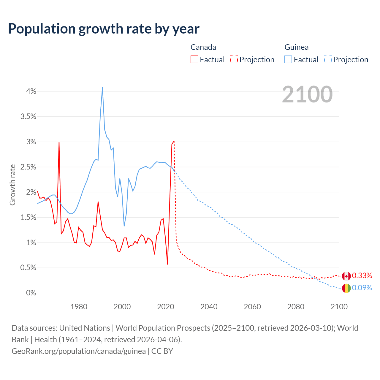 - For the last 10 years, Canada has had an average growth rate of +1.5% per year vs +2.54% in Guinea.