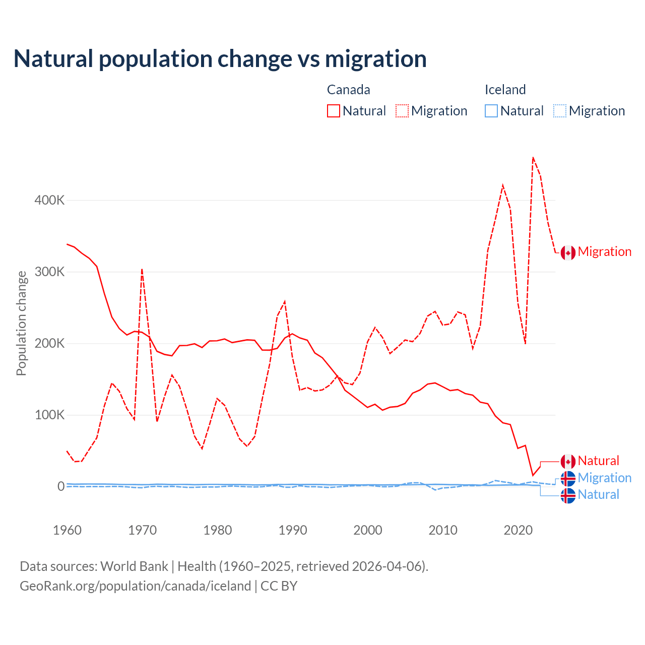 Over the last 10 years, 19.4% of the population change in Canada is from natural causes (a gain of 789,345 people) and 80.6% is from migration (a gain of 3,276,554 people). In Iceland 30.7% is from natural causes (a gain of 20,128 people) and 69.3% is from migration (a gain of 45,356 people).