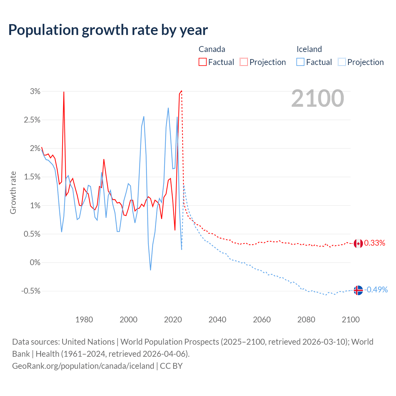 - For the last 10 years, Canada has had an average growth rate of +1.5% per year vs +1.63% in Iceland.
