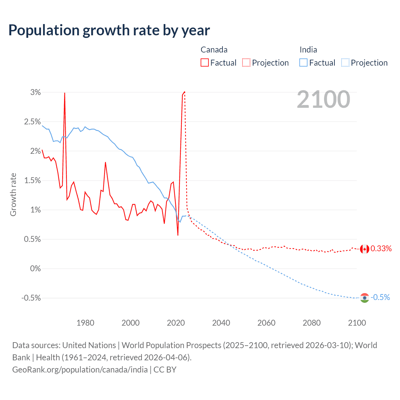 - For the last 10 years, Canada has had an average growth rate of +1.5% per year vs +1.03% in India.