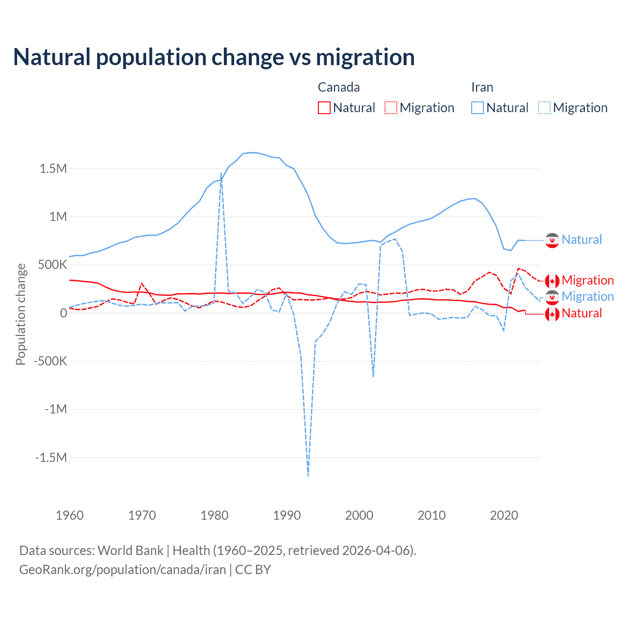 Over the last 10 years, 19.4% of the population change in Canada is from natural causes (a gain of 789,345 people) and 80.6% is from migration (a gain of 3,276,554 people). In Iran 92.5% is from natural causes (a gain of 9,405,860 people) and 7.46% is from migration (a gain of 757,979 people).