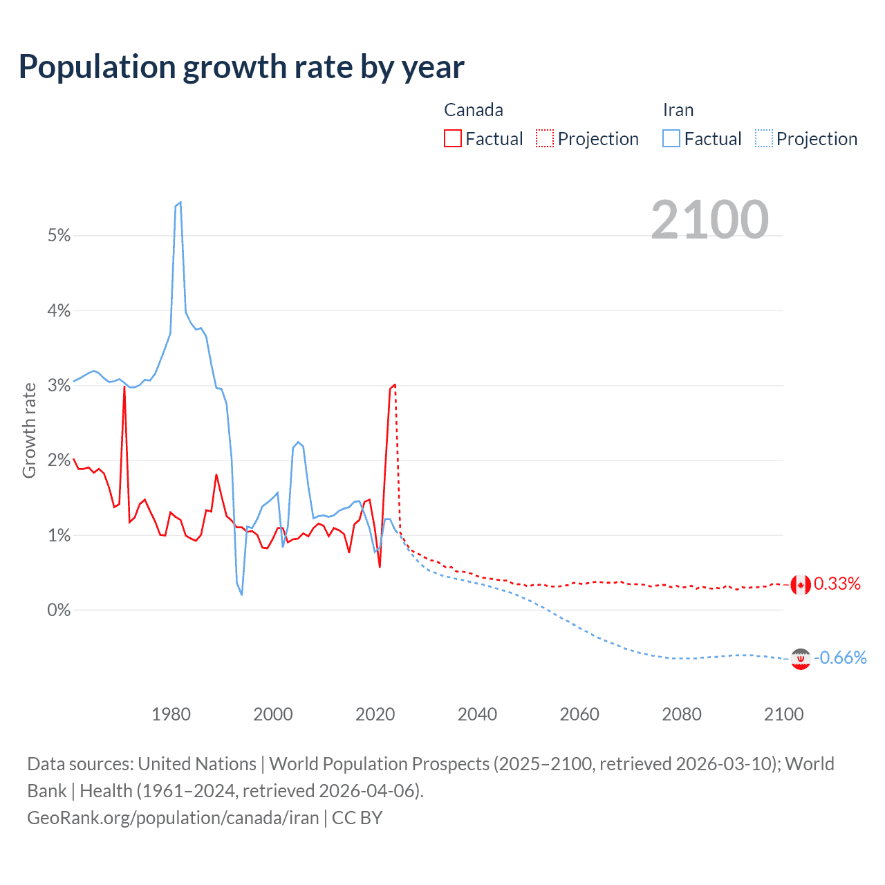 - For the last 10 years, Canada has had an average growth rate of +1.5% per year vs +1.19% in Iran.