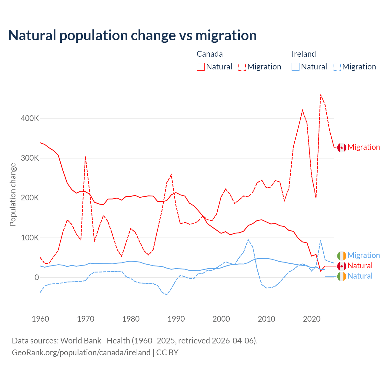 Over the last 10 years, 19.4% of the population change in Canada is from natural causes (a gain of 789,345 people) and 80.6% is from migration (a gain of 3,276,554 people). In Ireland 48.2% is from natural causes (a gain of 284,644 people) and 51.8% is from migration (a gain of 305,297 people).