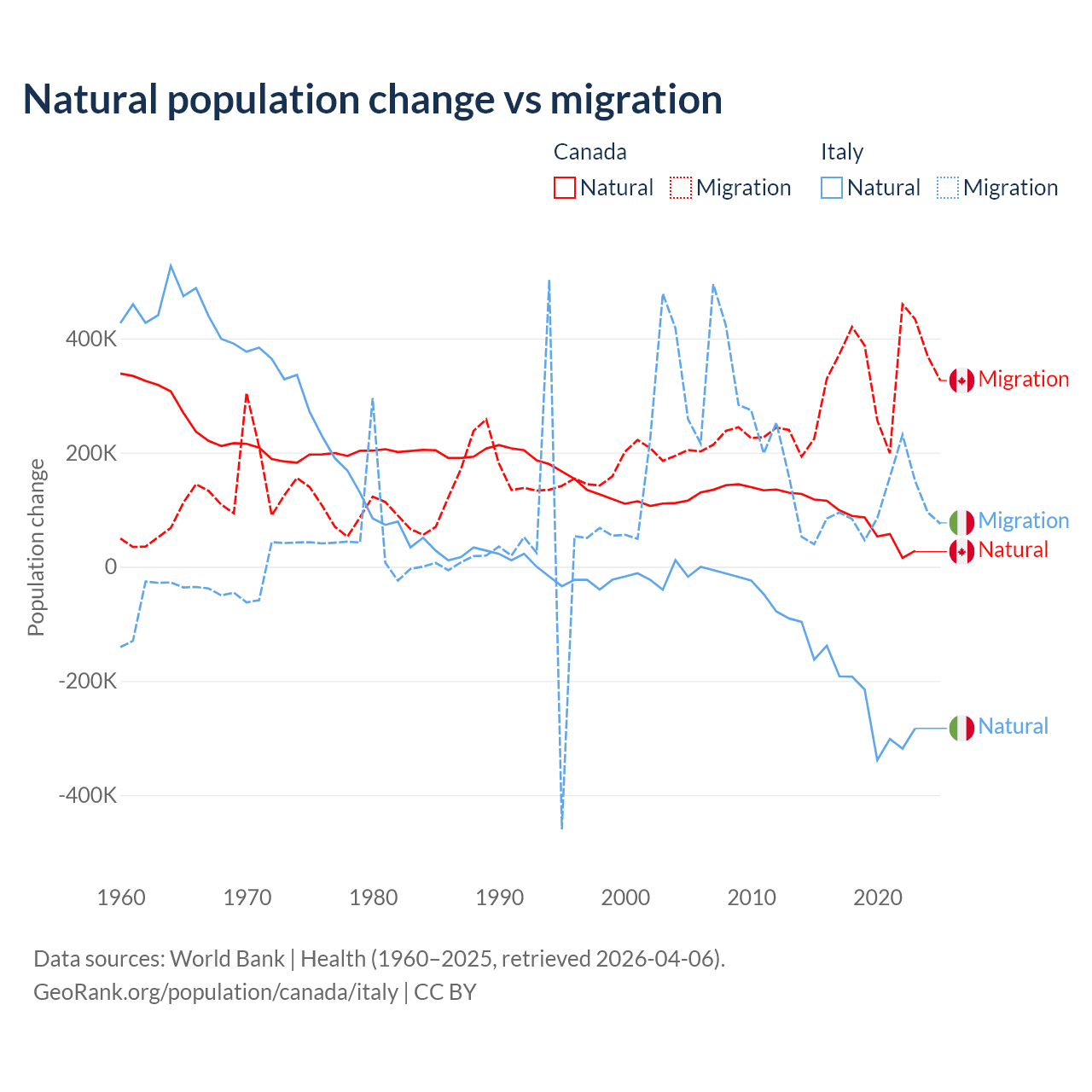 Over the last 10 years, 19.4% of the population change in Canada is from natural causes (a gain of 789,345 people) and 80.6% is from migration (a gain of 3,276,554 people). In Italy 68.6% is from natural causes (a loss of 2,239,084 people) and 31.4% is from migration (a gain of 1,026,128 people).