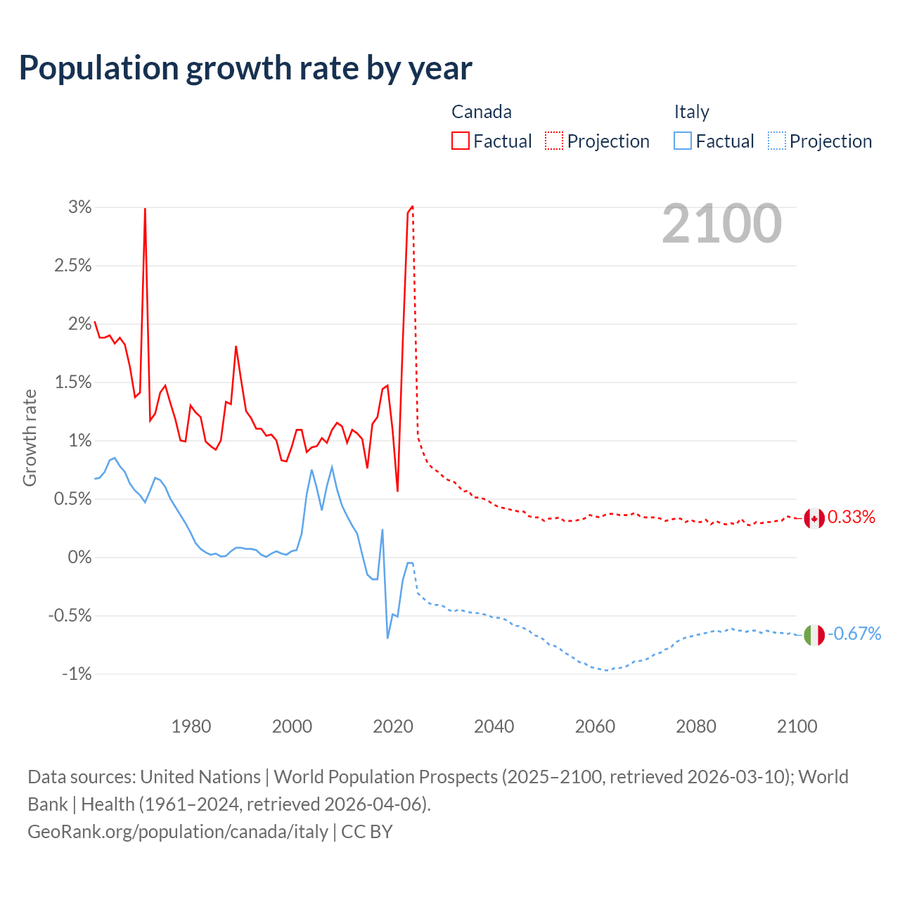 - For the last 10 years, Canada has had an average growth rate of +1.5% per year vs -0.21% in Italy.