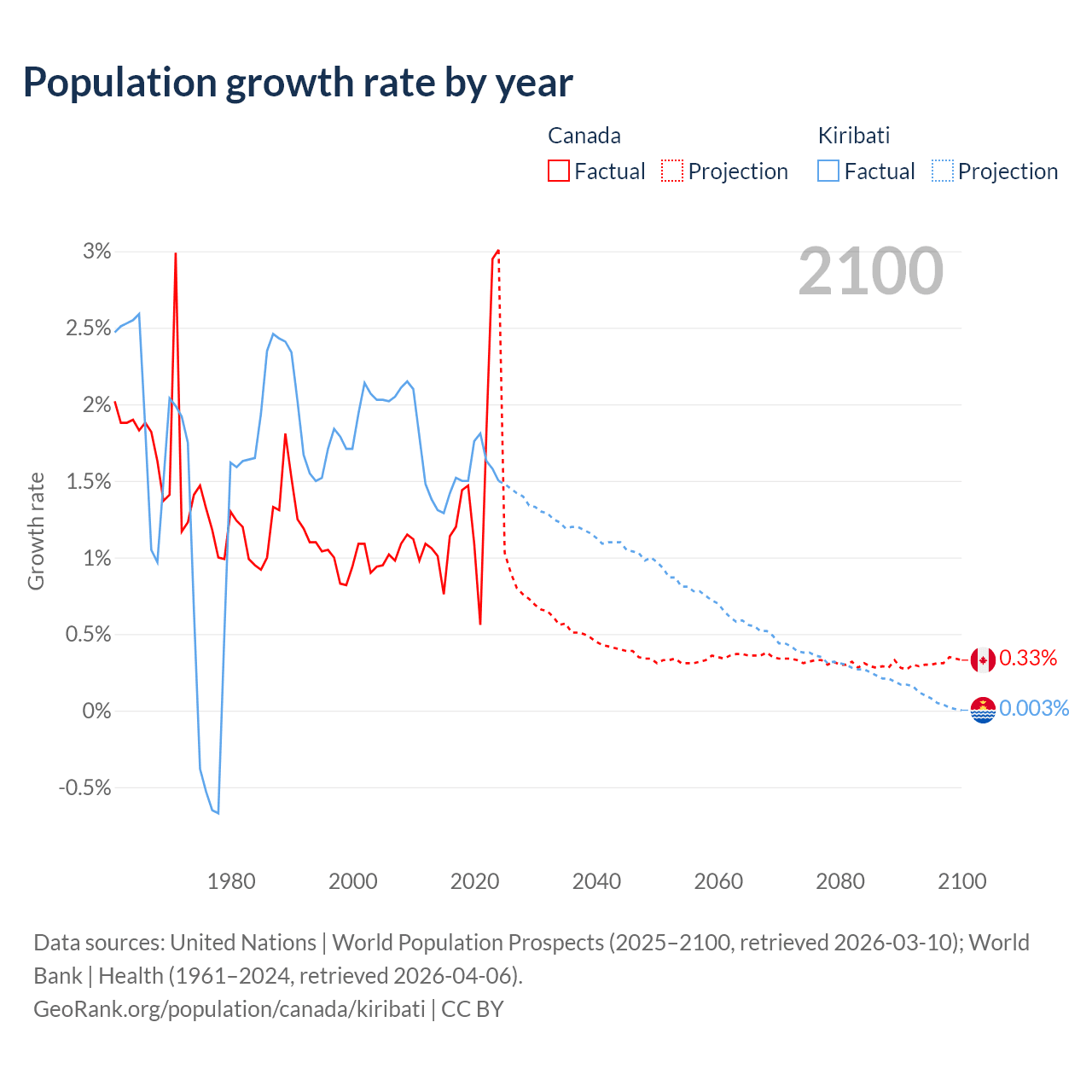 - For the last 10 years, Canada has had an average growth rate of +1.5% per year vs +1.53% in Kiribati.