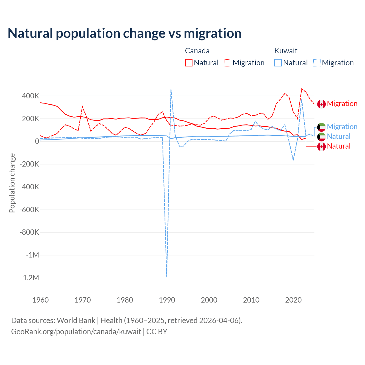 Over the last 10 years, 19.4% of the population change in Canada is from natural causes (a gain of 789,345 people) and 80.6% is from migration (a gain of 3,276,554 people). In Kuwait 35.8% is from natural causes (a gain of 470,645 people) and 64.2% is from migration (a gain of 845,142 people).