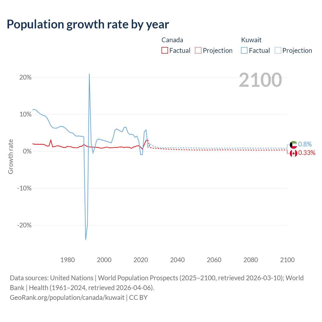 - For the last 10 years, Canada has had an average growth rate of +1.5% per year vs +3.1% in Kuwait.