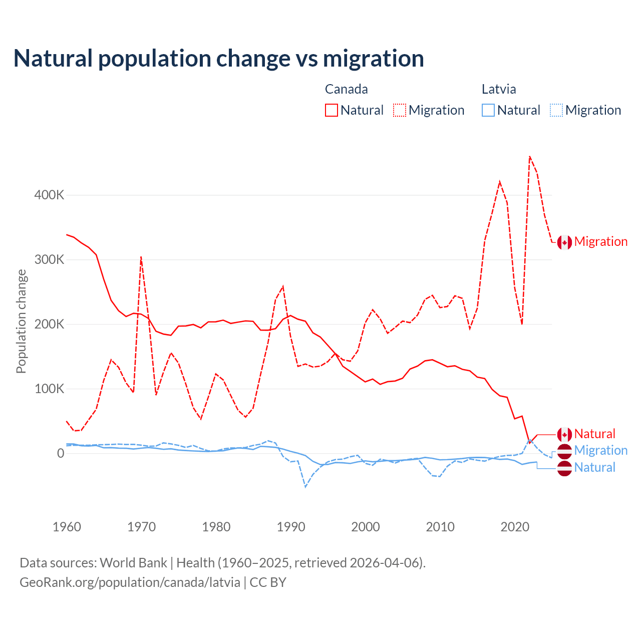 Over the last 10 years, 19.4% of the population change in Canada is from natural causes (a gain of 789,345 people) and 80.6% is from migration (a gain of 3,276,554 people). In Latvia 82.7% is from natural causes (a loss of 103,711 people) and 17.3% is from migration (a loss of 21,641 people).