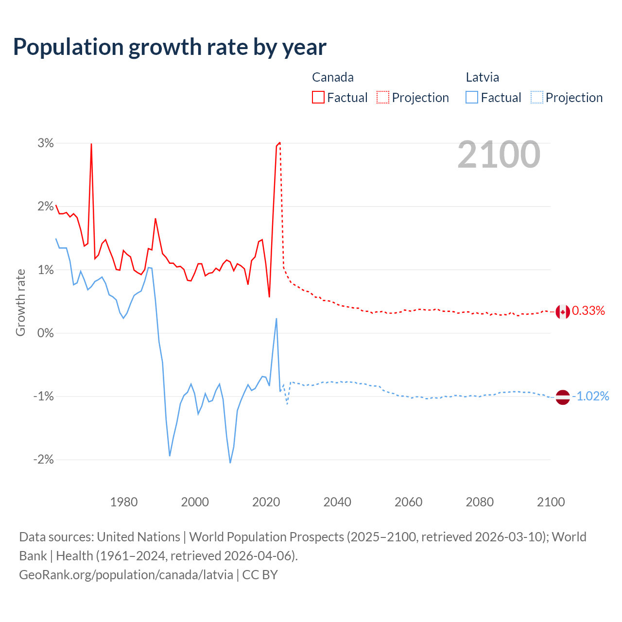- For the last 10 years, Canada has had an average growth rate of +1.5% per year vs -0.68% in Latvia.