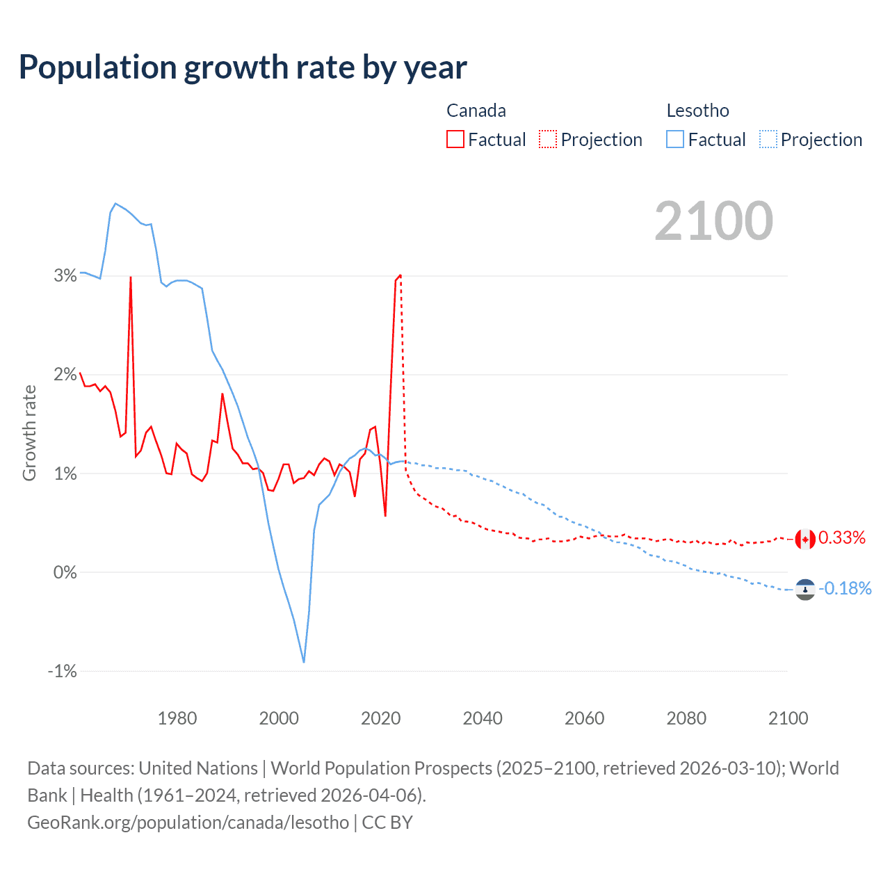 - For the last 10 years, Canada has had an average growth rate of +1.5% per year vs +1.17% in Lesotho.