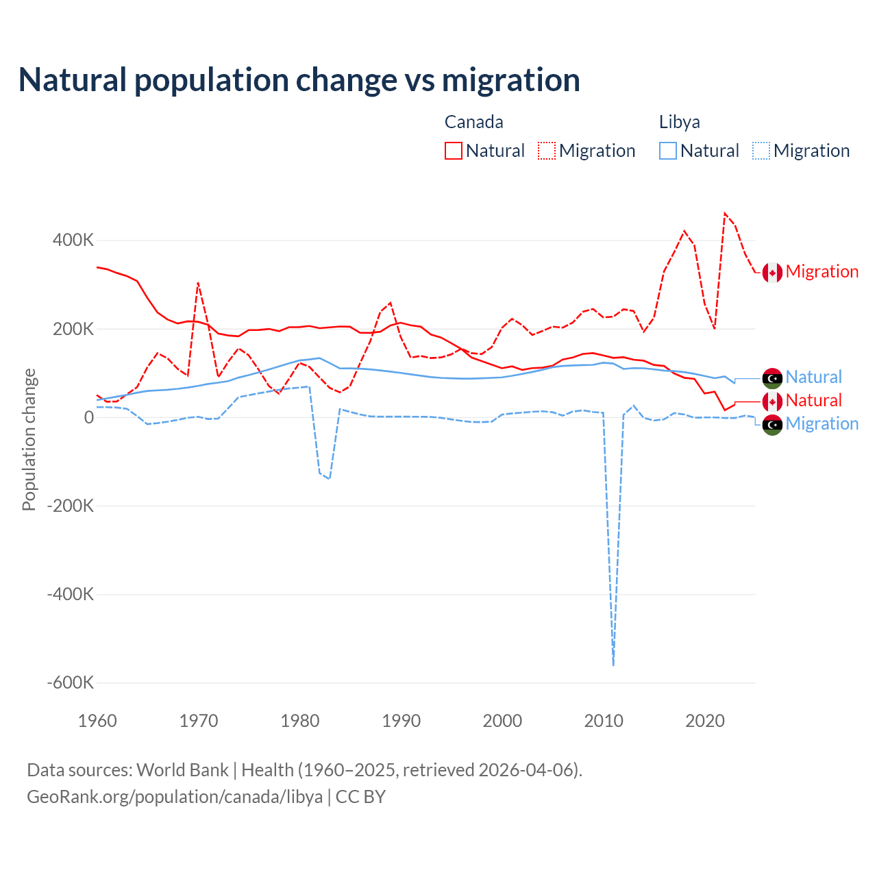 Over the last 10 years, 19.4% of the population change in Canada is from natural causes (a gain of 789,345 people) and 80.6% is from migration (a gain of 3,276,554 people). In Libya 99.4% is from natural causes (a gain of 975,799 people) and 0.63% is from migration (a loss of 6,150 people).