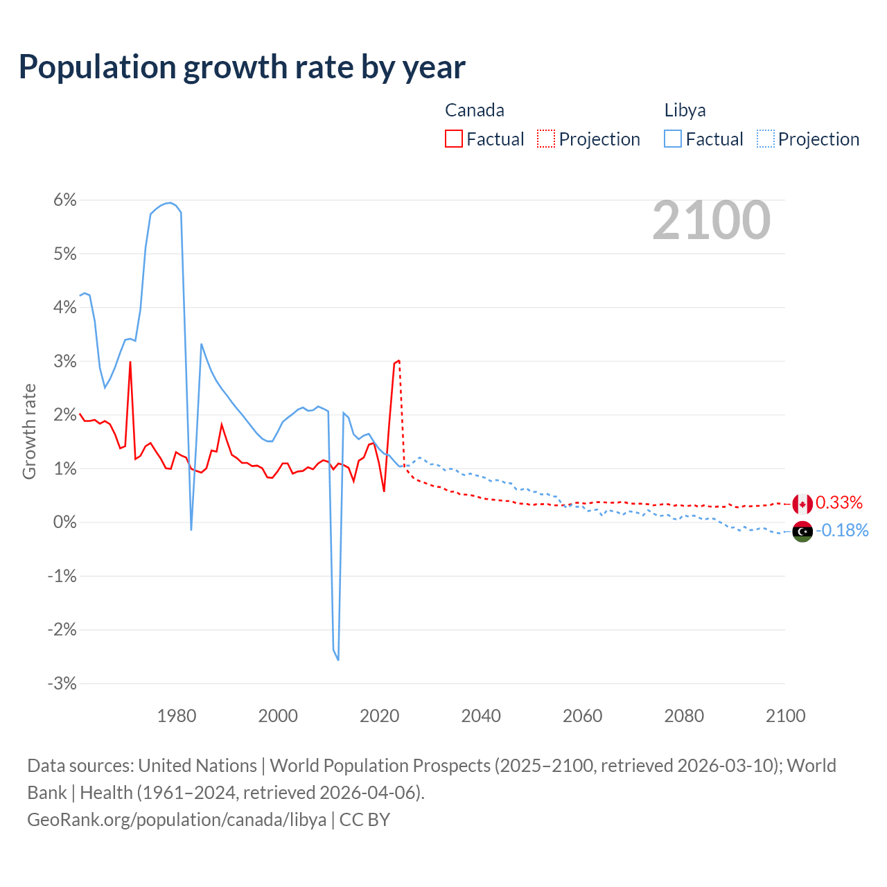 - For the last 10 years, Canada has had an average growth rate of +1.5% per year vs +1.44% in Libya.