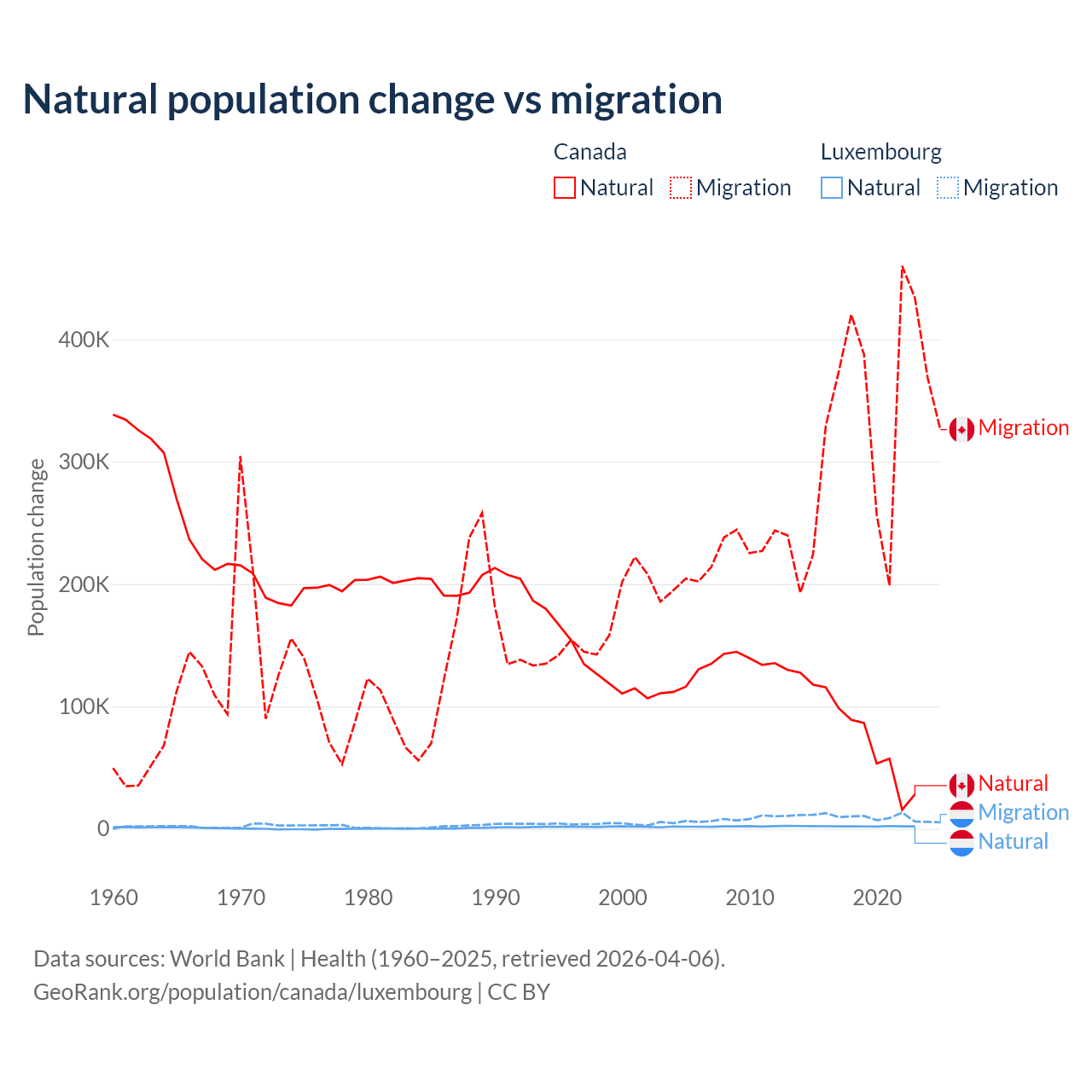 Over the last 10 years, 19.4% of the population change in Canada is from natural causes (a gain of 789,345 people) and 80.6% is from migration (a gain of 3,276,554 people). In Luxembourg 16.8% is from natural causes (a gain of 20,287 people) and 83.2% is from migration (a gain of 100,435 people).