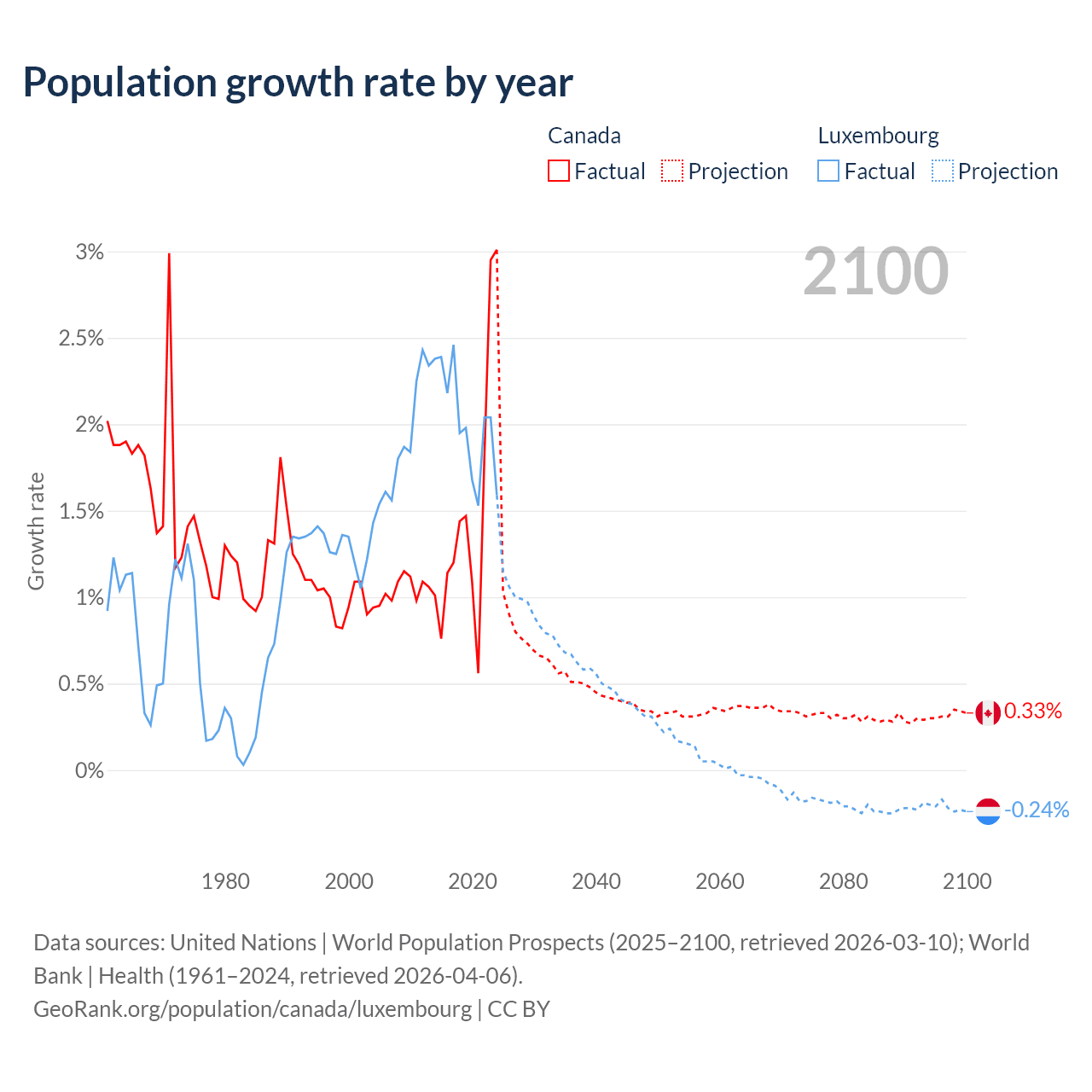 - For the last 10 years, Canada has had an average growth rate of +1.5% per year vs +2.02% in Luxembourg.