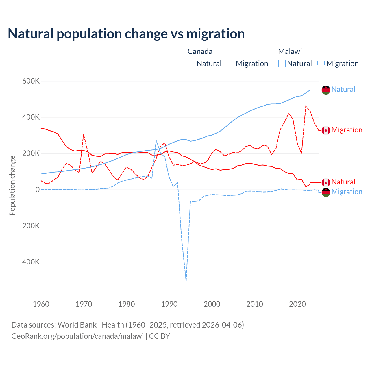 Over the last 10 years, 19.4% of the population change in Canada is from natural causes (a gain of 789,345 people) and 80.6% is from migration (a gain of 3,276,554 people). In Malawi 99.3% is from natural causes (a gain of 5,019,393 people) and 0.67% is from migration (a loss of 33,768 people).