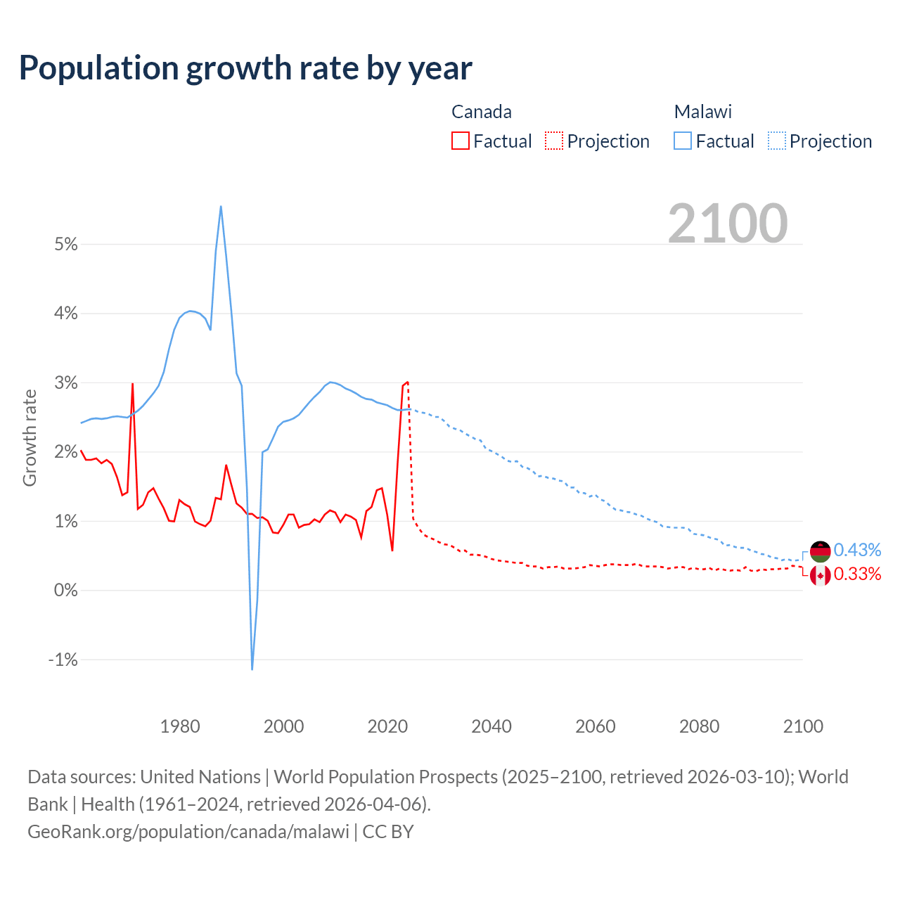 - For the last 10 years, Canada has had an average growth rate of +1.5% per year vs +2.7% in Malawi.