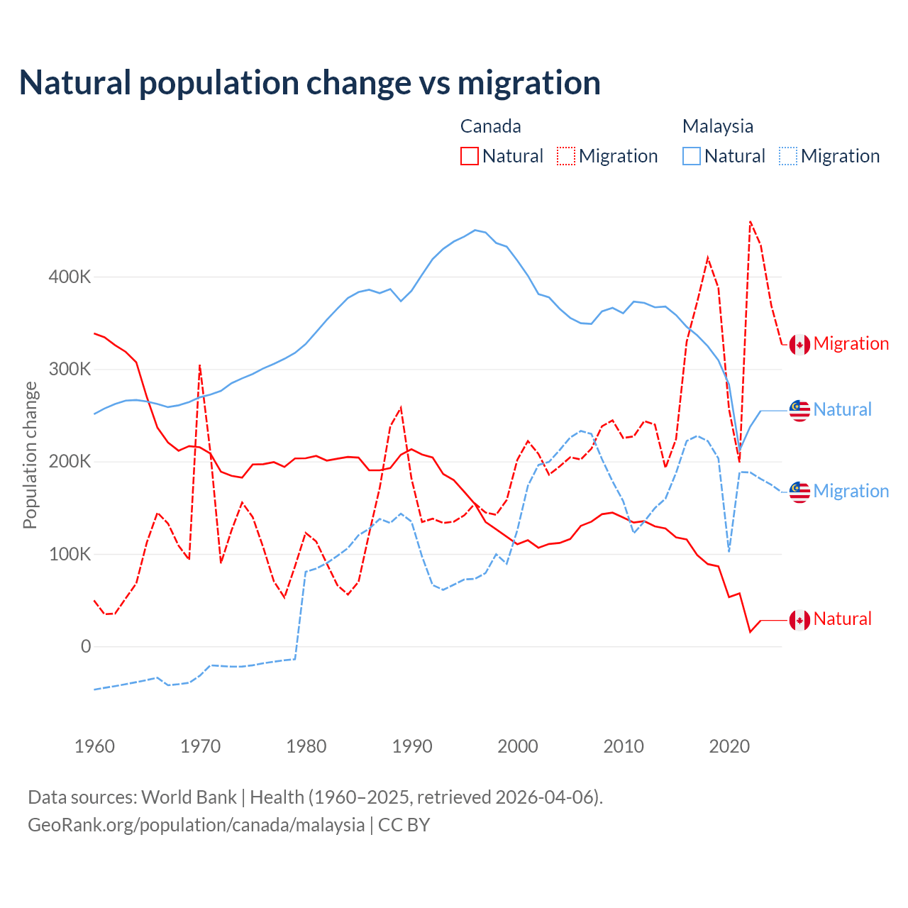 Over the last 10 years, 19.4% of the population change in Canada is from natural causes (a gain of 789,345 people) and 80.6% is from migration (a gain of 3,276,554 people). In Malaysia 61.7% is from natural causes (a gain of 3,029,648 people) and 38.3% is from migration (a gain of 1,882,159 people).