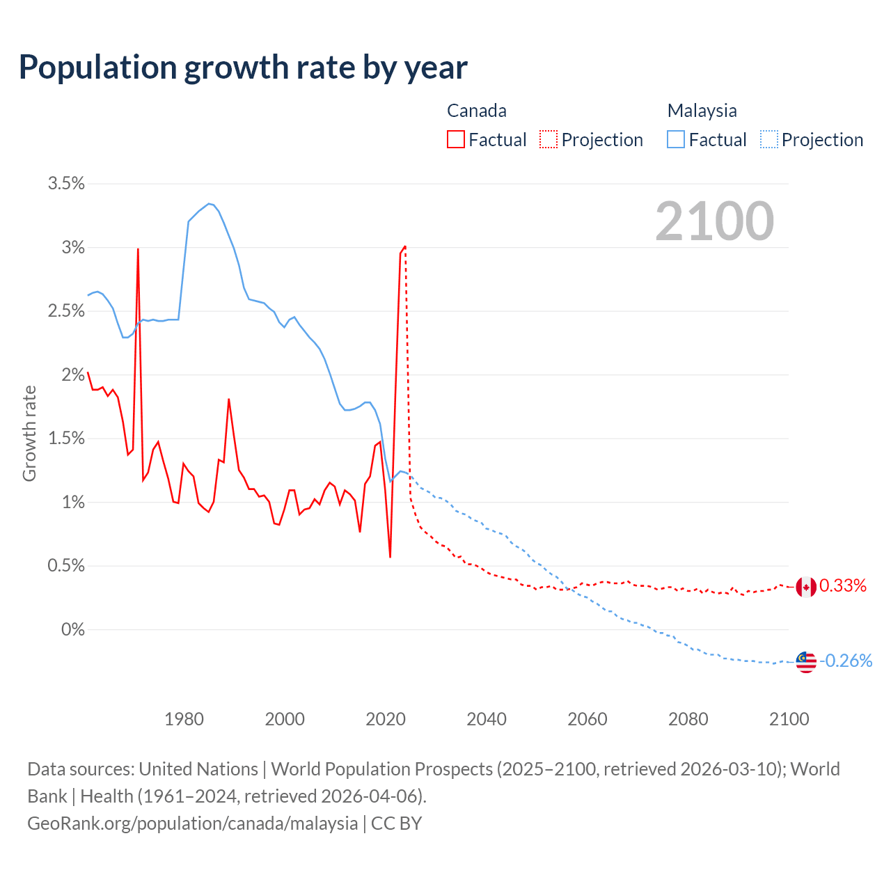 - For the last 10 years, Canada has had an average growth rate of +1.5% per year vs +1.5% in Malaysia.