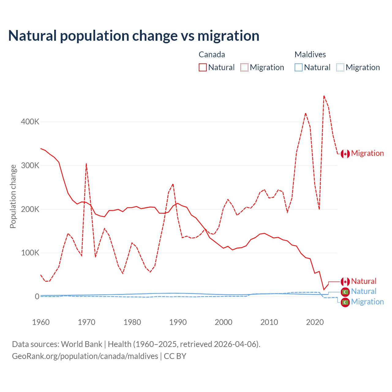 Over the last 10 years, 19.4% of the population change in Canada is from natural causes (a gain of 789,345 people) and 80.6% is from migration (a gain of 3,276,554 people). In Maldives 42.7% is from natural causes (a gain of 51,342 people) and 57.3% is from migration (a gain of 68,788 people).