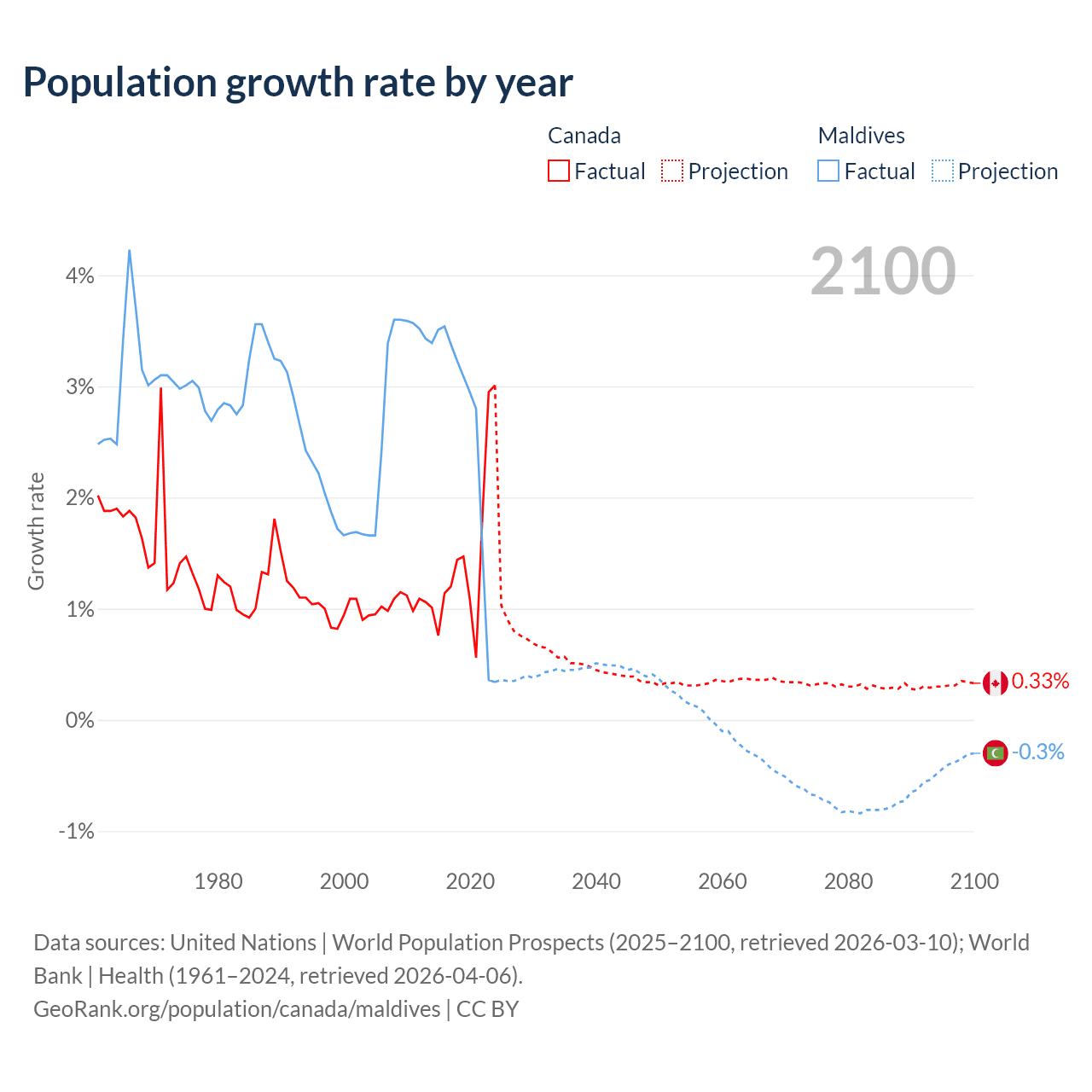 - For the last 10 years, Canada has had an average growth rate of +1.5% per year vs +2.56% in Maldives.