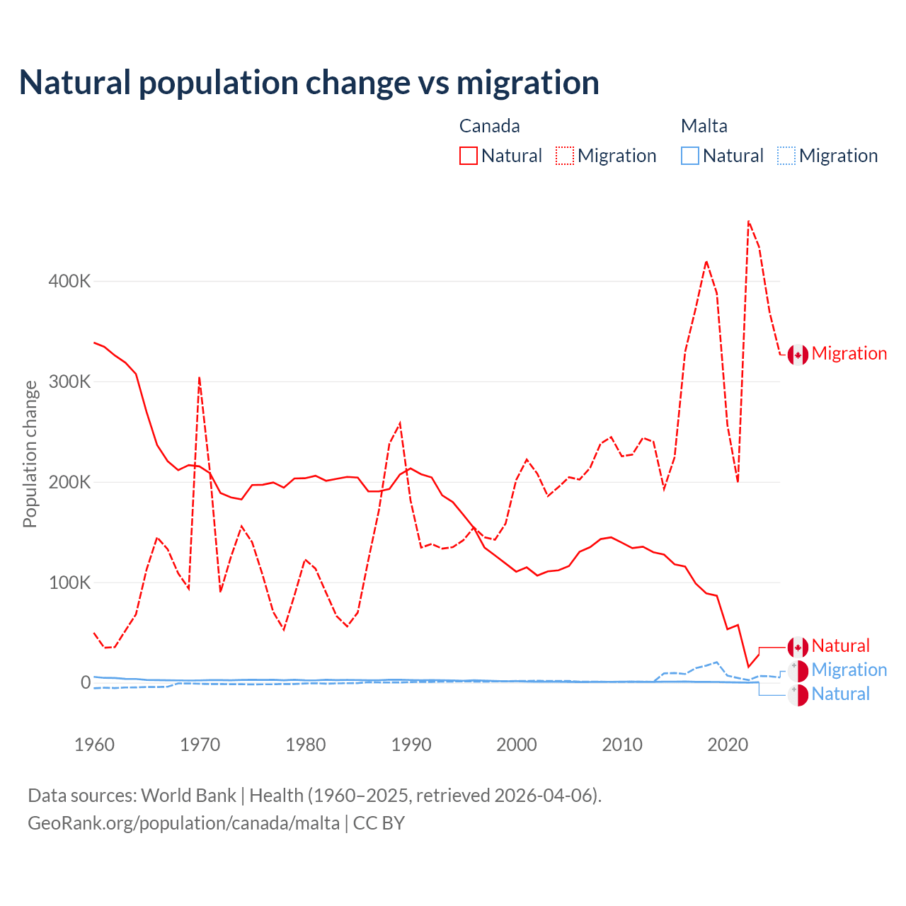 Over the last 10 years, 19.4% of the population change in Canada is from natural causes (a gain of 789,345 people) and 80.6% is from migration (a gain of 3,276,554 people). In Malta 5.84% is from natural causes (a gain of 6,181 people) and 94.2% is from migration (a gain of 99,652 people).