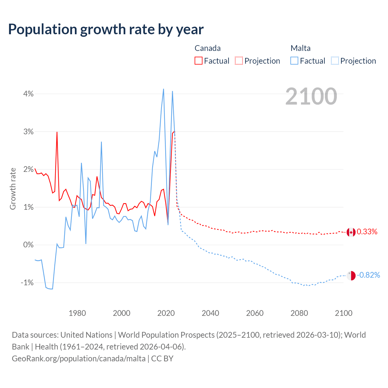 - For the last 10 years, Canada has had an average growth rate of +1.5% per year vs +2.69% in Malta.