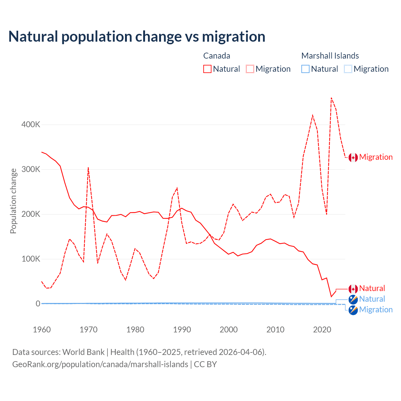 Over the last 10 years, 19.4% of the population change in Canada is from natural causes (a gain of 789,345 people) and 80.6% is from migration (a gain of 3,276,554 people). In the Marshall Islands 27.8% is from natural causes (a gain of 7,592 people) and 72.2% is from migration (a loss of 19,682 people).