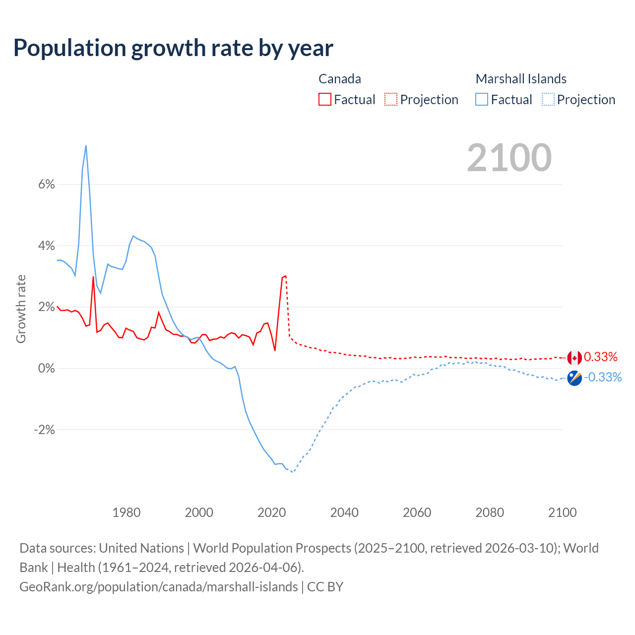 - For the last 10 years, Canada has had an average growth rate of +1.5% per year vs -2.69% in the Marshall Islands.