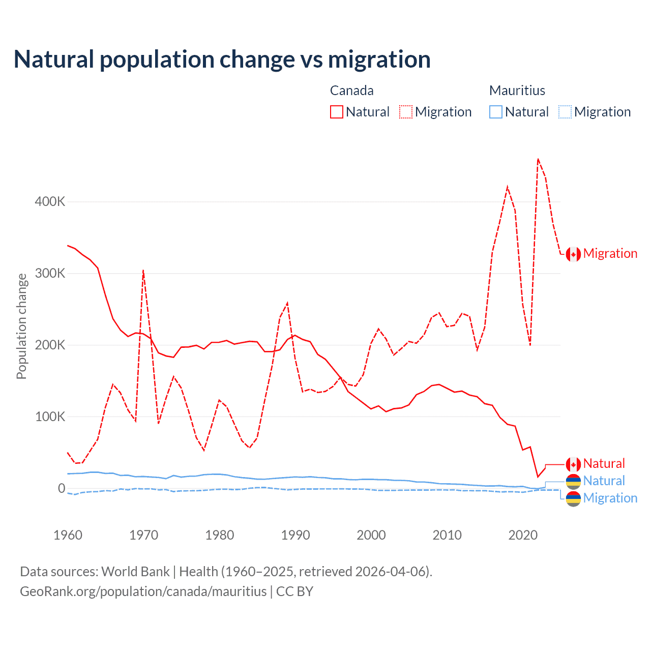 Over the last 10 years, 19.4% of the population change in Canada is from natural causes (a gain of 789,345 people) and 80.6% is from migration (a gain of 3,276,554 people). In Mauritius 30.9% is from natural causes (a gain of 19,327 people) and 69.1% is from migration (a loss of 43,294 people).