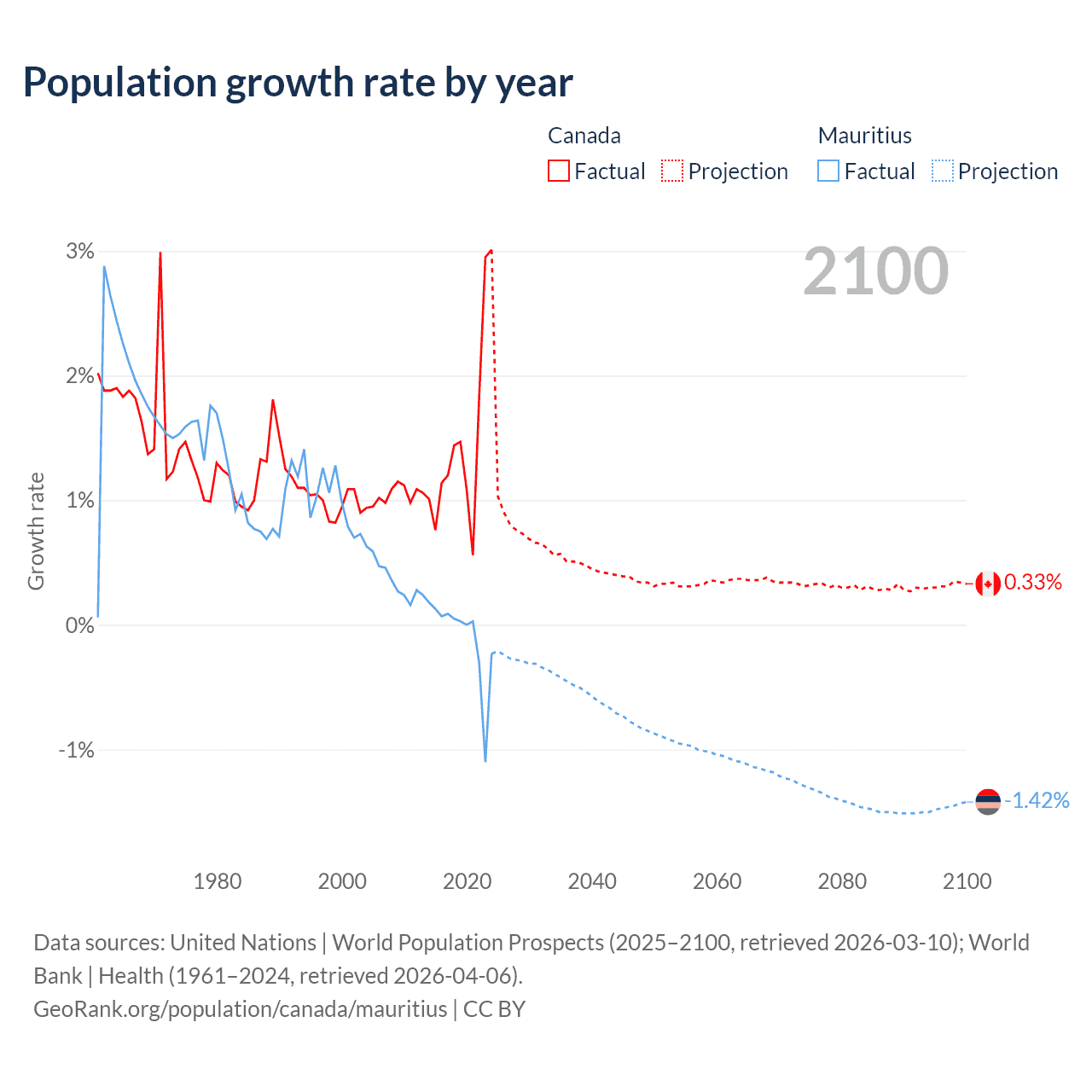 - For the last 10 years, Canada has had an average growth rate of +1.5% per year vs -0.09% in Mauritius.