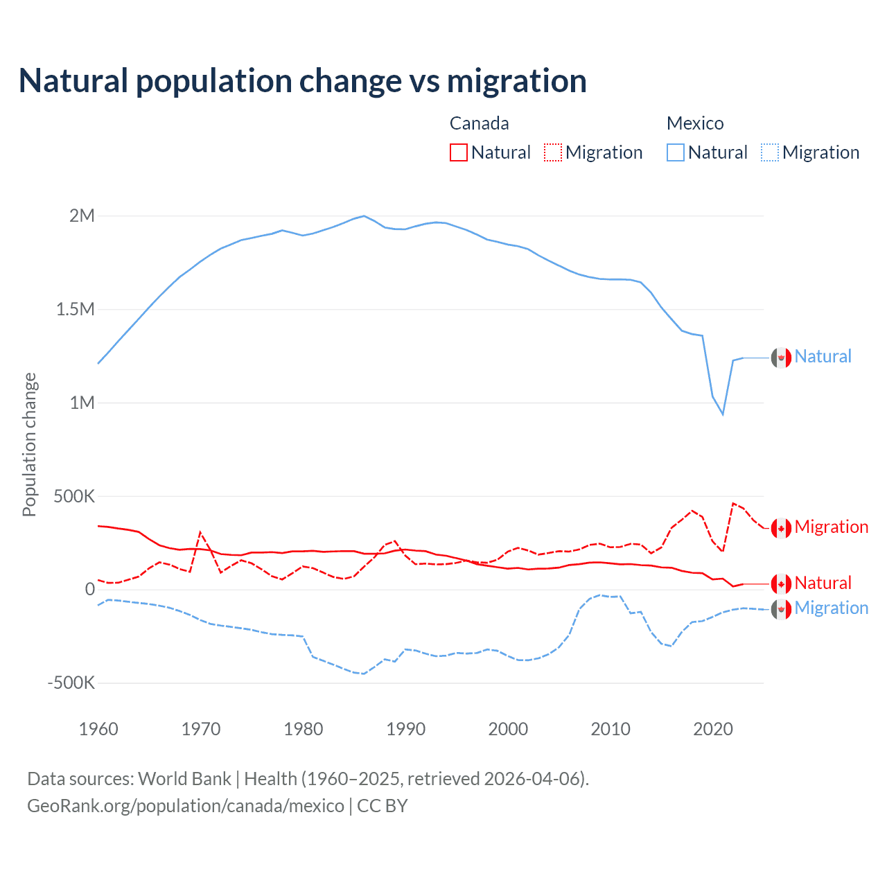 Over the last 10 years, 19.4% of the population change in Canada is from natural causes (a gain of 789,345 people) and 80.6% is from migration (a gain of 3,276,554 people). In Mexico 87.5% is from natural causes (a gain of 13,080,136 people) and 12.5% is from migration (a loss of 1,876,544 people).