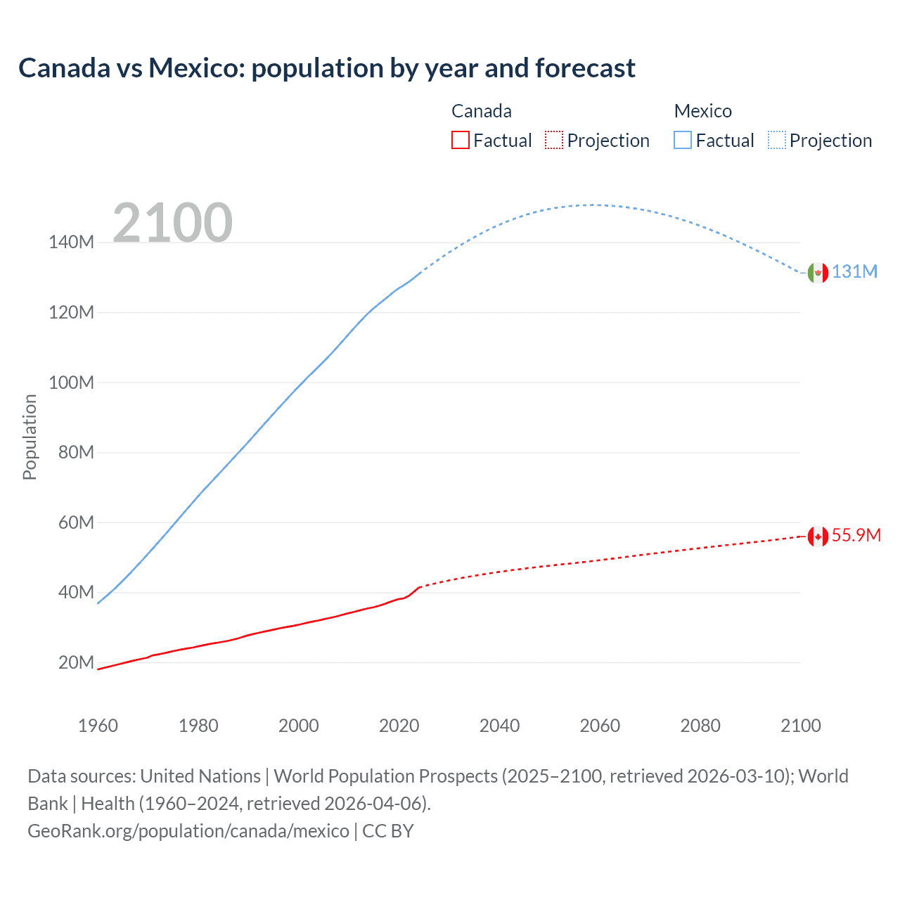 The latest officially reported population of Canada was 41,288,599 in 2024 vs 130,861,007 people in Mexico in 2024. In 2026, based on the adjusted UN estimation, the current Canada's population is 42,181,965 people compared to 133,323,134 in Mexico.