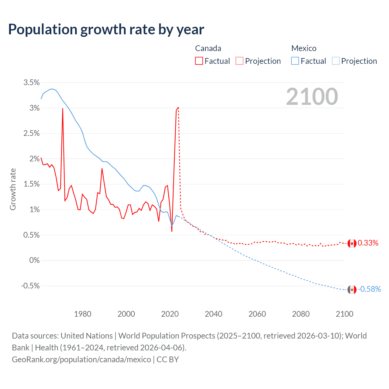 - For the last 10 years, Canada has had an average growth rate of +1.5% per year vs +0.92% in Mexico.