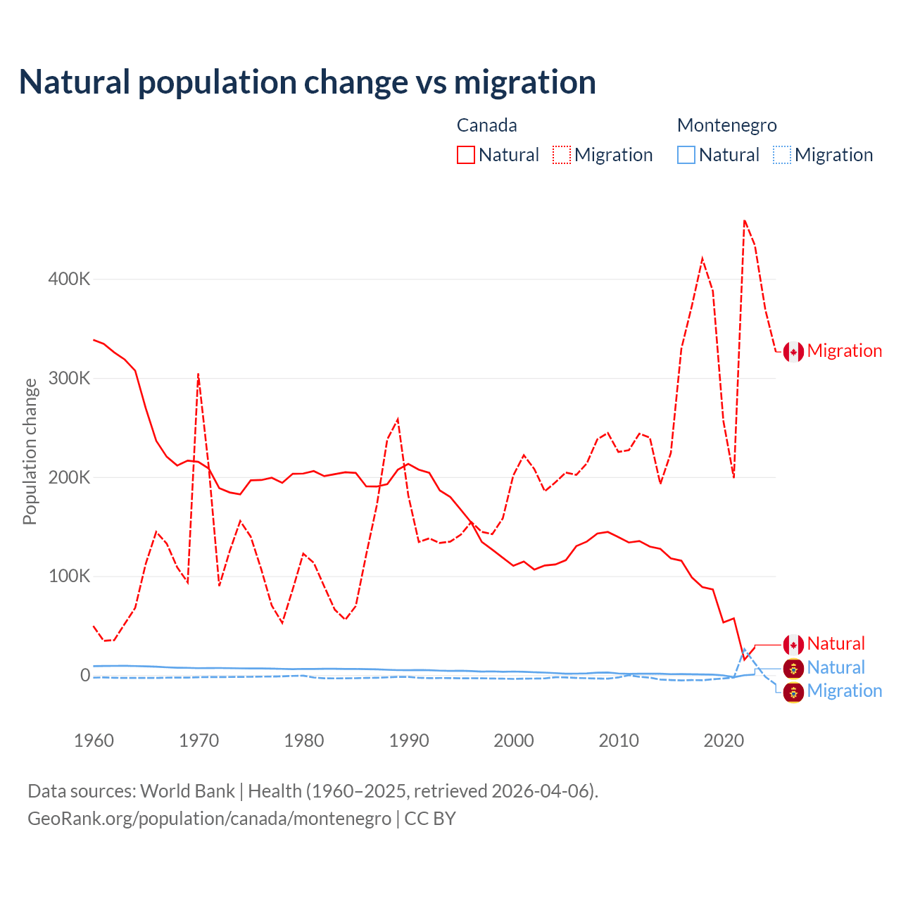 Over the last 10 years, 19.4% of the population change in Canada is from natural causes (a gain of 789,345 people) and 80.6% is from migration (a gain of 3,276,554 people). In Montenegro 52.4% is from natural causes (a gain of 4,501 people) and 47.6% is from migration (a gain of 4,095 people).