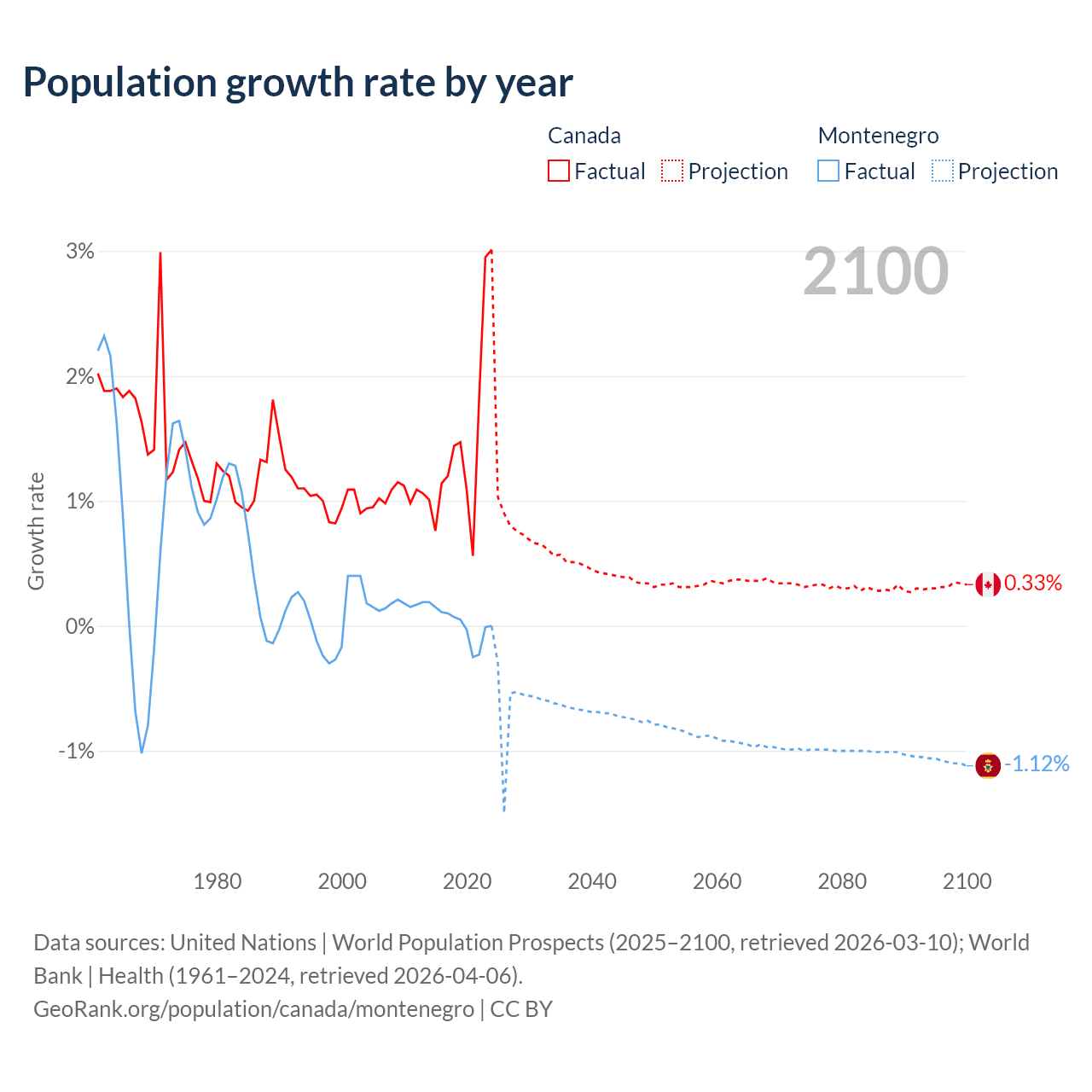 - For the last 10 years, Canada has had an average growth rate of +1.5% per year vs +0.01% in Montenegro.