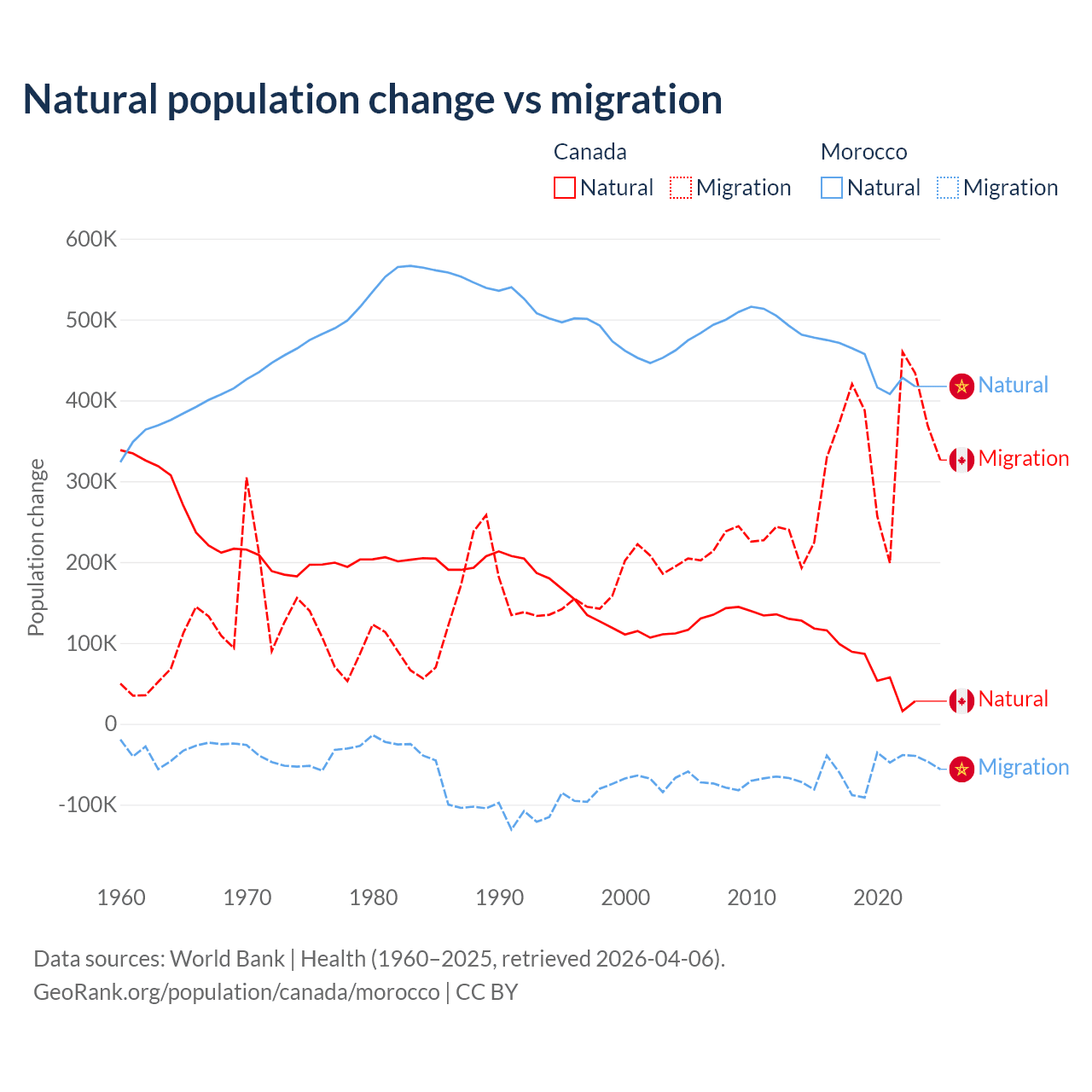 Over the last 10 years, 19.4% of the population change in Canada is from natural causes (a gain of 789,345 people) and 80.6% is from migration (a gain of 3,276,554 people). In Morocco 88.3% is from natural causes (a gain of 4,495,223 people) and 11.7% is from migration (a loss of 594,083 people).