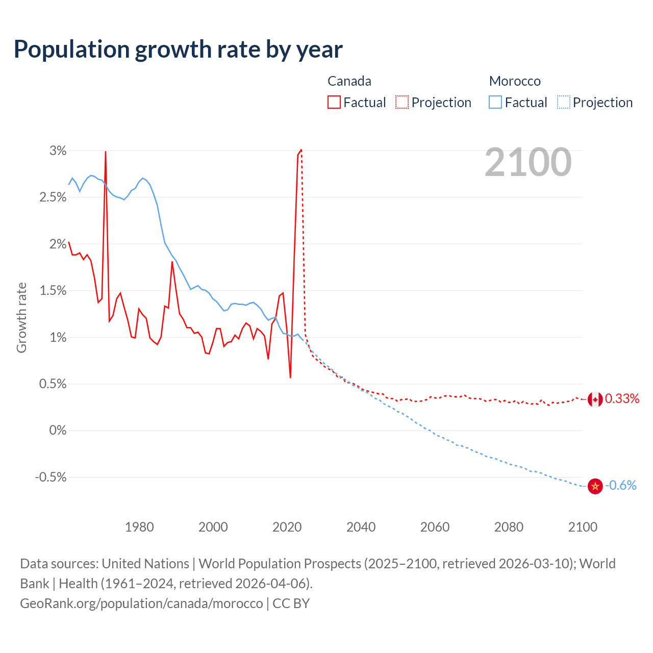 - For the last 10 years, Canada has had an average growth rate of +1.5% per year vs +1.09% in Morocco.