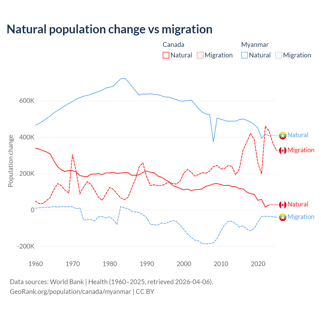 Over the last 10 years, 19.4% of the population change in Canada is from natural causes (a gain of 789,345 people) and 80.6% is from migration (a gain of 3,276,554 people). In Myanmar 86% is from natural causes (a gain of 4,594,615 people) and 14% is from migration (a loss of 749,272 people).