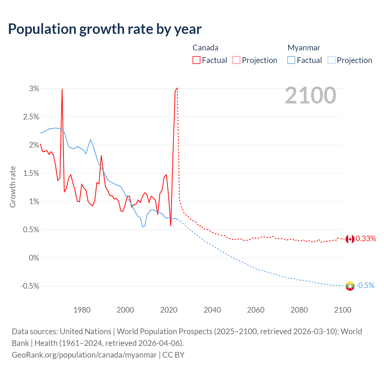 - For the last 10 years, Canada has had an average growth rate of +1.5% per year vs +0.74% in Myanmar.