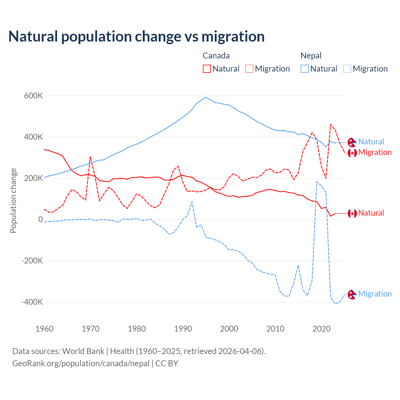 Over the last 10 years, 19.4% of the population change in Canada is from natural causes (a gain of 789,345 people) and 80.6% is from migration (a gain of 3,276,554 people). In Nepal 67.9% is from natural causes (a gain of 3,909,749 people) and 32.1% is from migration (a loss of 1,851,664 people).