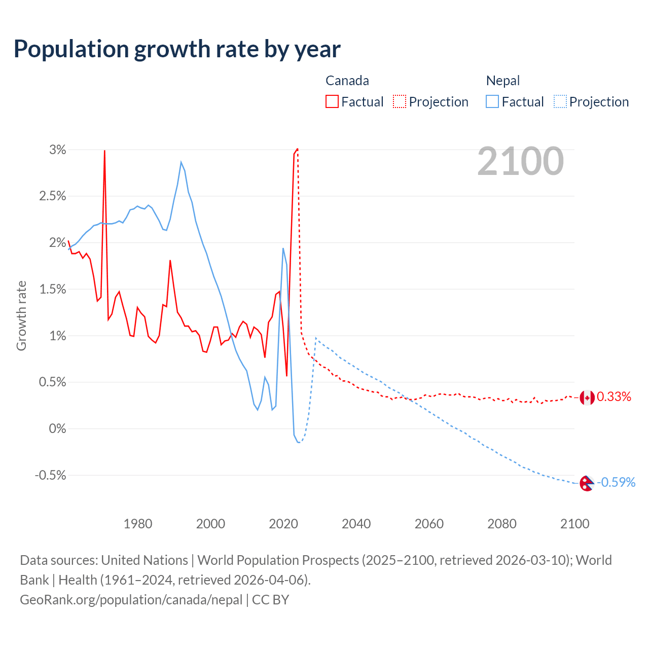 - For the last 10 years, Canada has had an average growth rate of +1.5% per year vs +0.66% in Nepal.