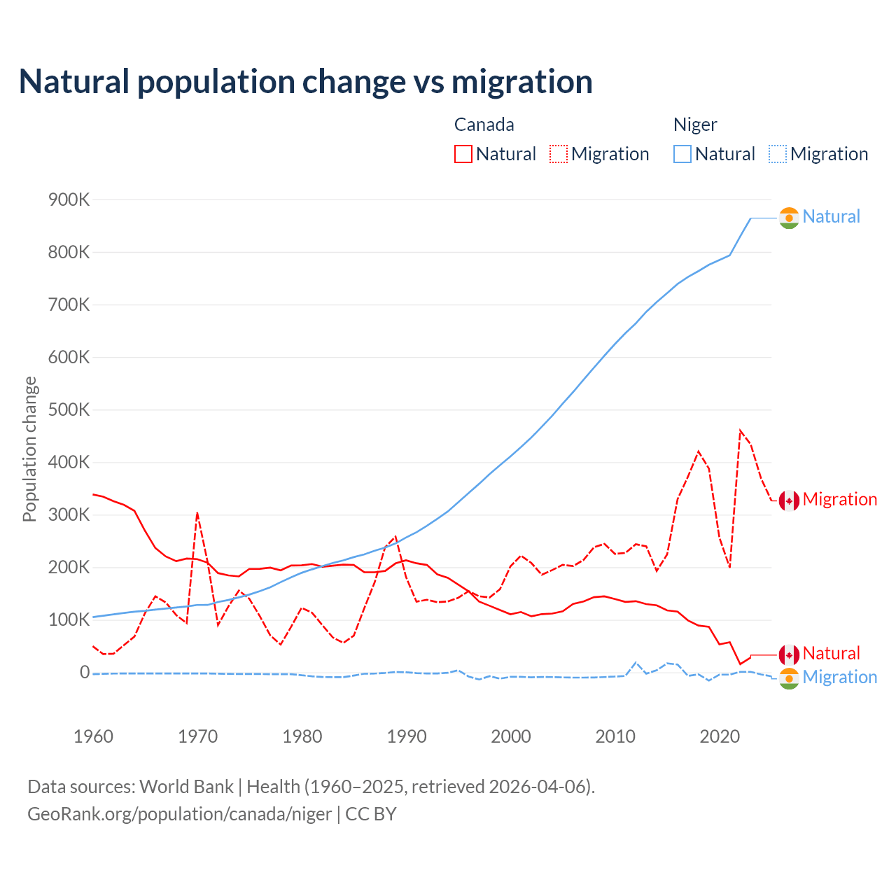 Over the last 10 years, 19.4% of the population change in Canada is from natural causes (a gain of 789,345 people) and 80.6% is from migration (a gain of 3,276,554 people). In Niger 100% is from natural causes (a gain of 7,728,287 people) and 0.03% is from migration (a gain of 2,520 people).