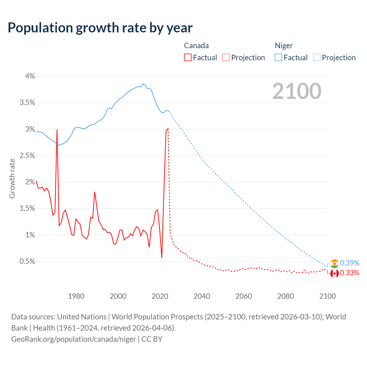 - For the last 10 years, Canada has had an average growth rate of +1.5% per year vs +3.5% in Niger.