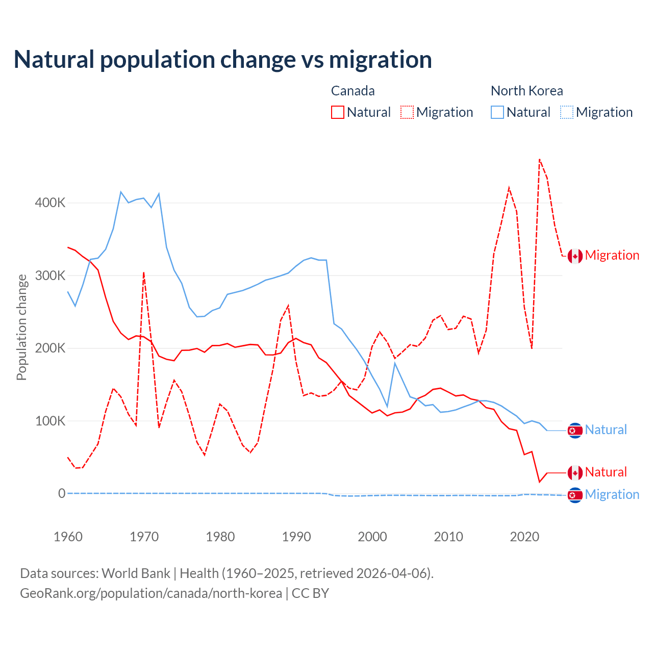 Over the last 10 years, 19.4% of the population change in Canada is from natural causes (a gain of 789,345 people) and 80.6% is from migration (a gain of 3,276,554 people). In North Korea 97.7% is from natural causes (a gain of 1,097,372 people) and 2.33% is from migration (a loss of 26,227 people).