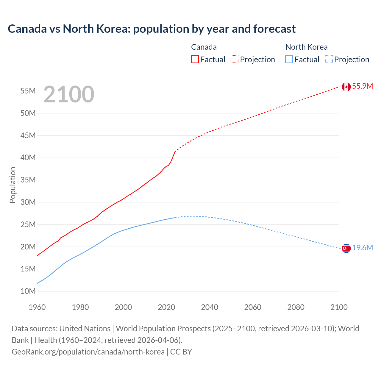 Canada vs North Korea: population by year and forecast