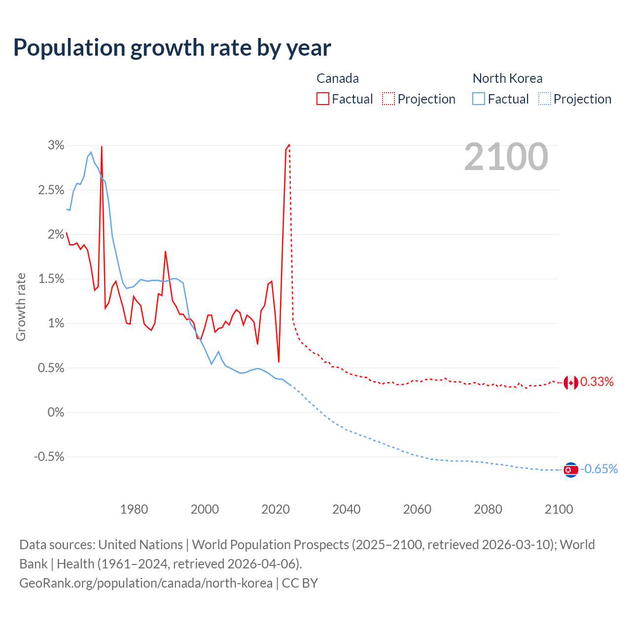 - For the last 10 years, Canada has had an average growth rate of +1.5% per year vs +0.41% in North Korea.