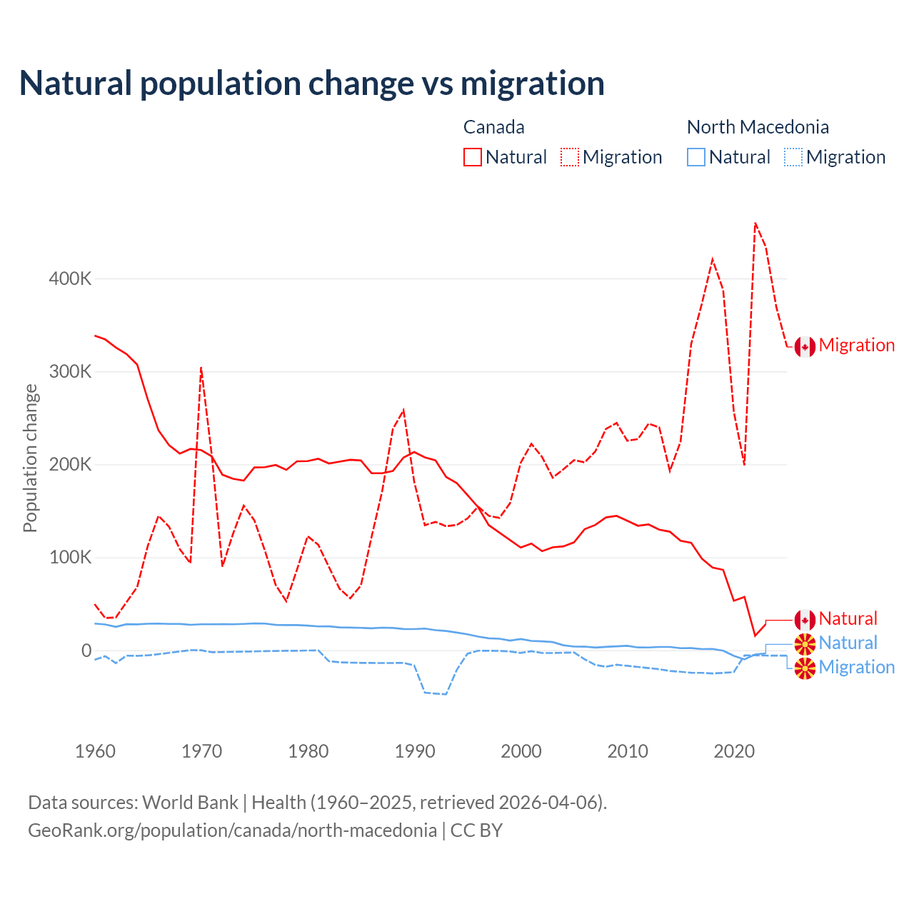Over the last 10 years, 19.4% of the population change in Canada is from natural causes (a gain of 789,345 people) and 80.6% is from migration (a gain of 3,276,554 people). In North Macedonia 6.45% is from natural causes (a loss of 12,585 people) and 93.5% is from migration (a loss of 182,429 people).