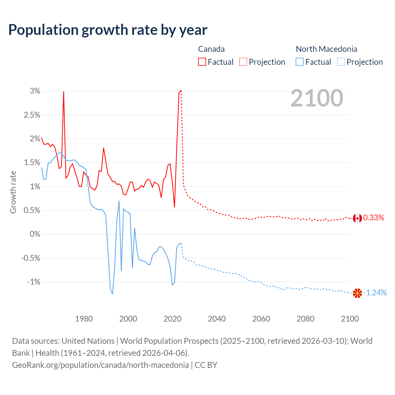 - For the last 10 years, Canada has had an average growth rate of +1.5% per year vs -0.48% in North Macedonia.