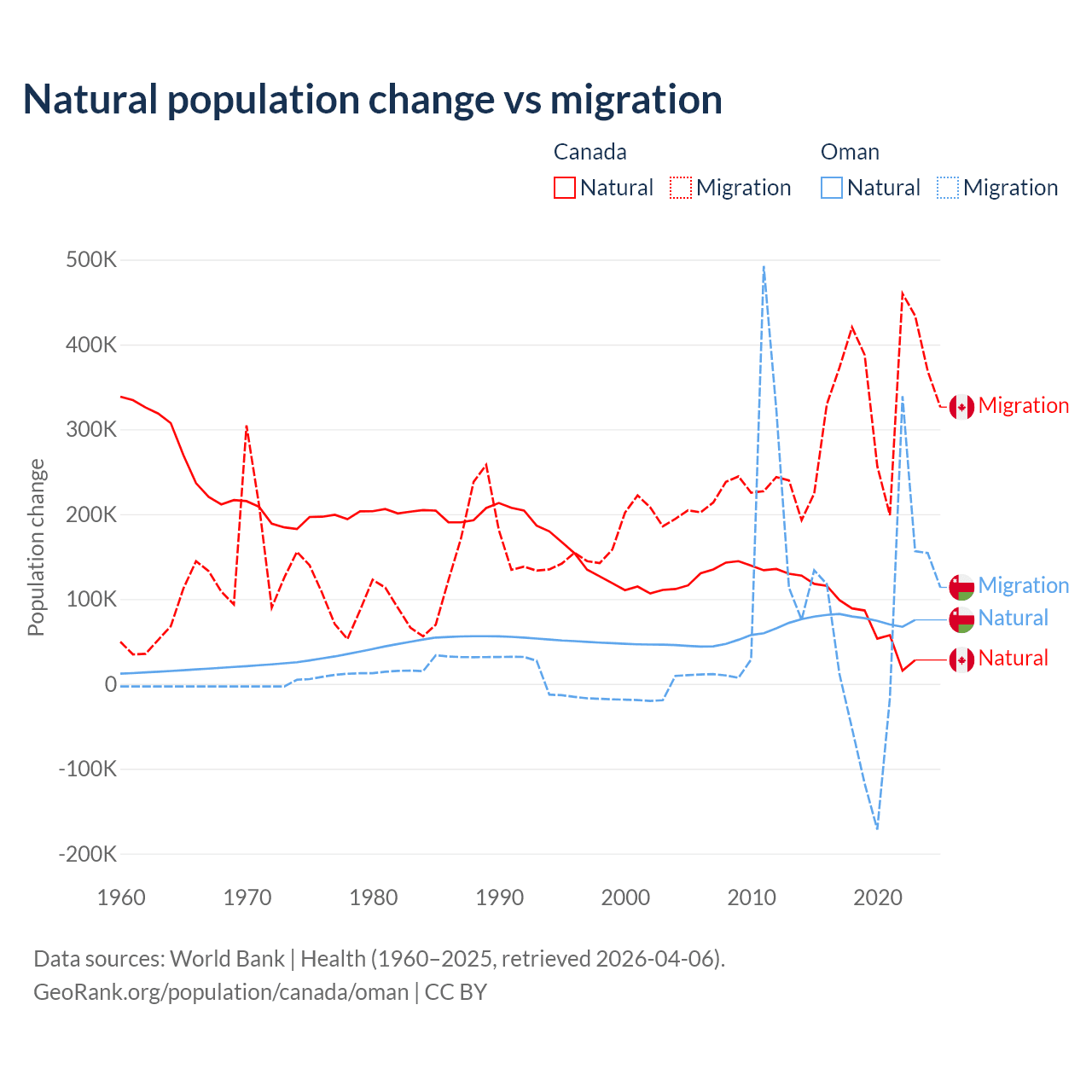 Over the last 10 years, 19.4% of the population change in Canada is from natural causes (a gain of 789,345 people) and 80.6% is from migration (a gain of 3,276,554 people). In Oman 61.6% is from natural causes (a gain of 763,049 people) and 38.4% is from migration (a gain of 475,565 people).